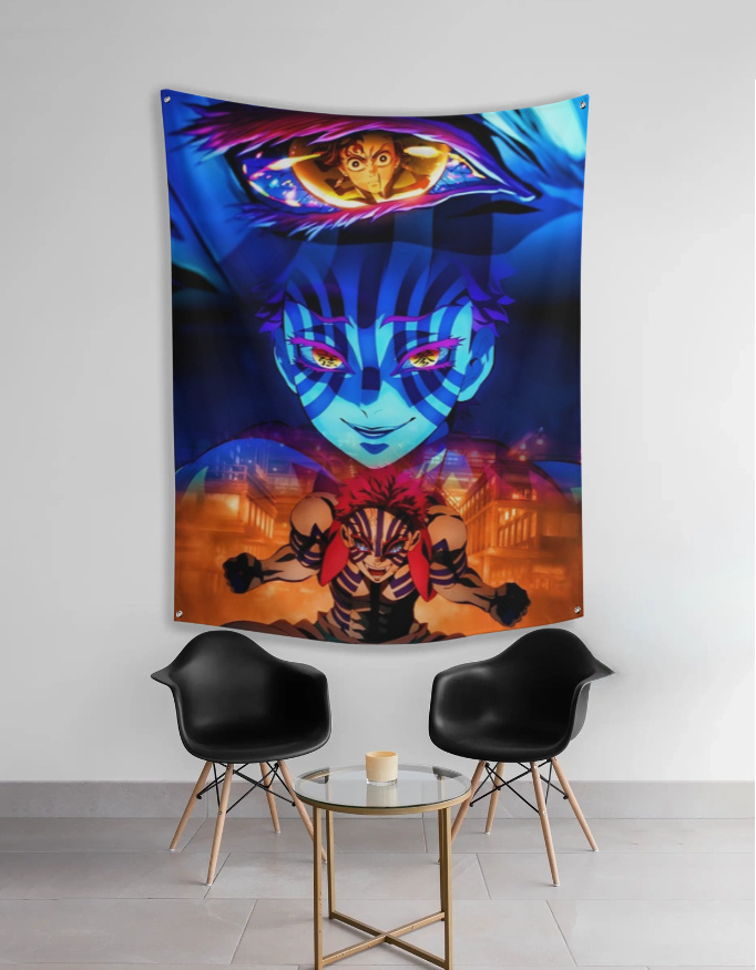 ransform your walls into a scene straight out of Demon Slayer with the Akaza Upper Moon Three Wall Tapestry. Featuring Akaza’s piercing stare, his iconic striped markings, and his overwhelming aura, this piece perfectly captures the dark beauty of the Demon Moons. The striking blue-and-orange contrast gives your room a dramatic anime aesthetic — whether hung in your bedroom, gaming setup, or living space.