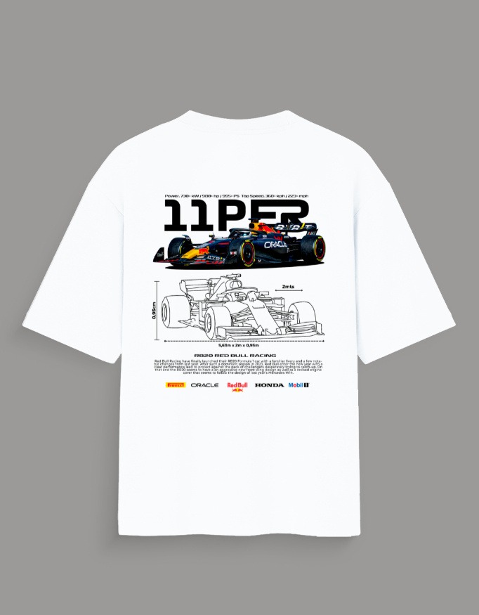 Celebrate the speed, precision, and power of Sergio “Checo” Pérez and the RB20 with this dynamic F1-themed oversized tee. Highlighting the full side render of the Oracle Red Bull Racing car, the shirt also features a precise line diagram and key technical specs — from power to top speed — making it perfect for fans who love both performance and design.